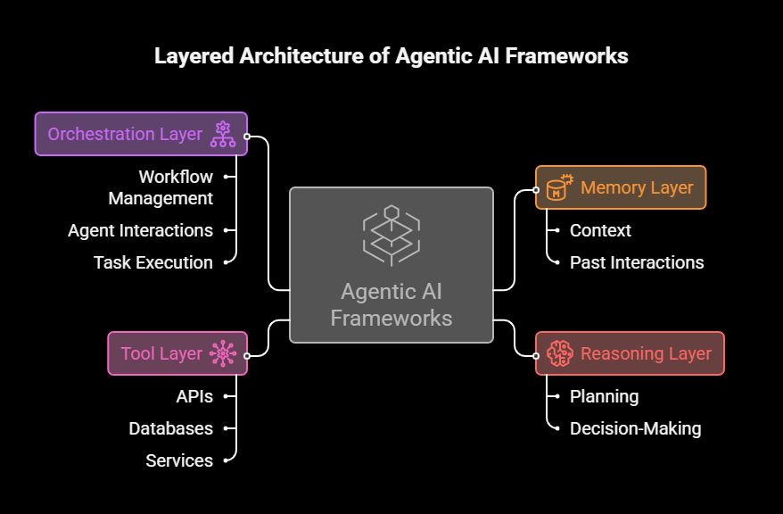 Agentic AI frameworks rely on layered architectures to enable autonomous behavior. The core layers include: