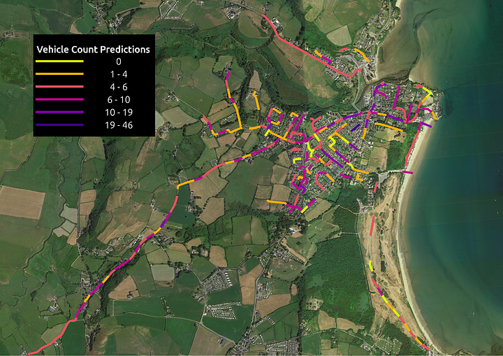 For the deployment phase, the input is a dataset full of road shapefiles. In this instance, we used the Wales shapefiles dataset from OpenStreetMap. From there, we chose a sample area in Abersoch to show the example predictions. These road shapefiles were preprocessed by slicing them to approx 100m road. The idea was that the users can use the shapefile to get any corresponding georeferenced image and then pass those images for prediction as seen below.