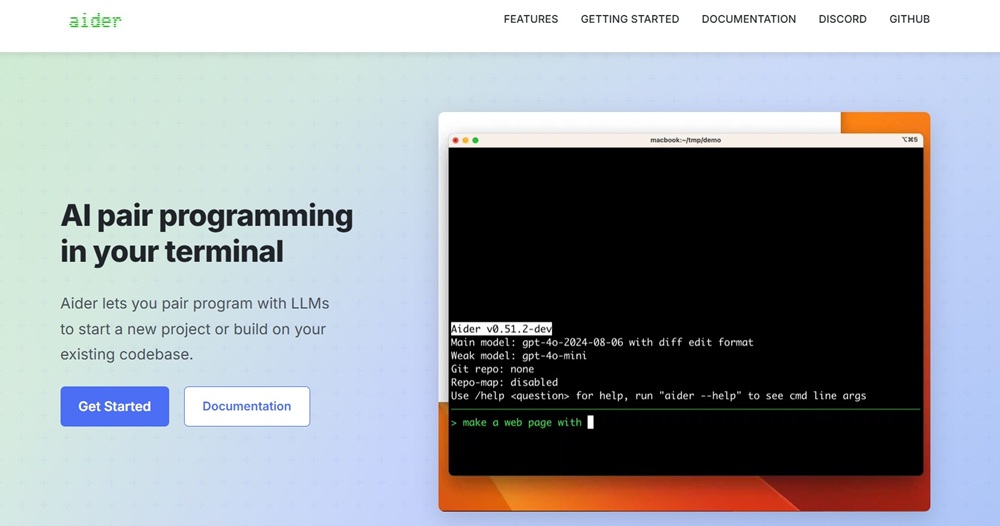 Aider is a terminal-based AI pair programming tool that works directly with your local Git repository. Instead of replacing the IDE, it fits into the command-line workflow many experienced developers already prefer.