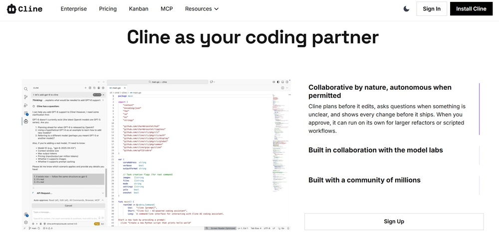 Cline is an open-source autonomous coding agent for VS Code aimed at developers who want transparency and model flexibility. It can inspect files, propose plans, run commands with permission, and handle multi-step work.