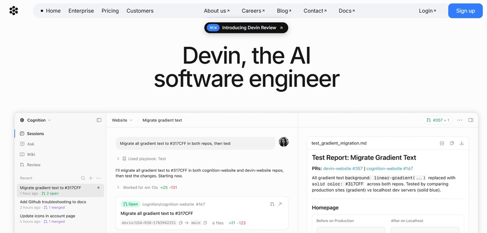 Devin is positioned as an autonomous AI software engineer that can take on larger end-to-end tasks such as planning, coding, debugging, and execution. It is notable because it aims to own chunks of work rather than just suggest code.