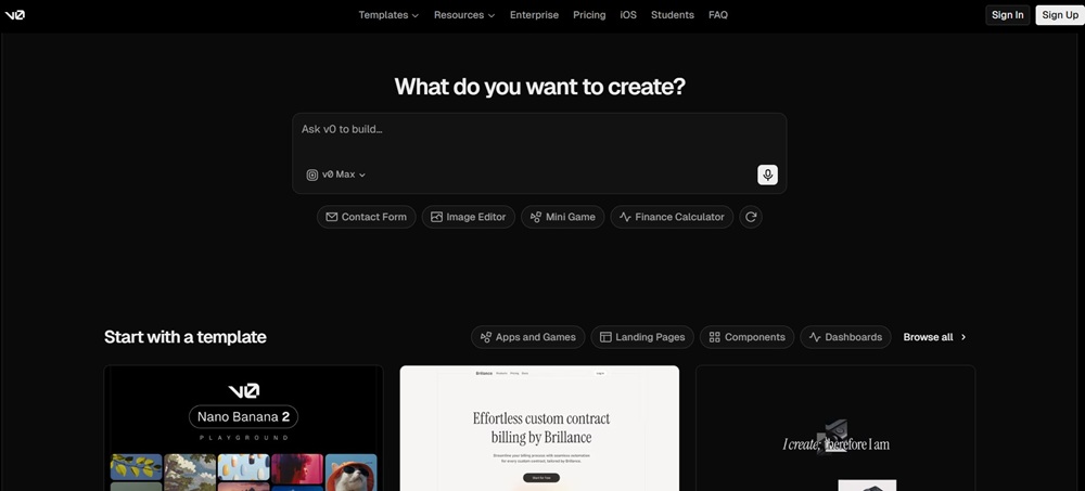 V0 by Vercel specializes in generating modern UI and frontend components, especially for React and Next.js projects. It is built for fast interface generation with a cleaner frontend output than many general-purpose tools.
