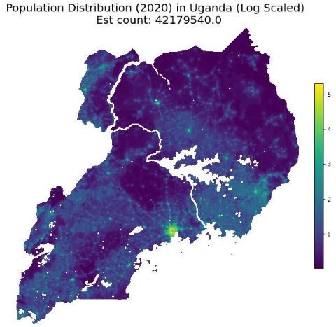 title = 'Population Distribution (2020) in Uganda (Log Scaled) n Est count: {}'.format(uga_pop_count)