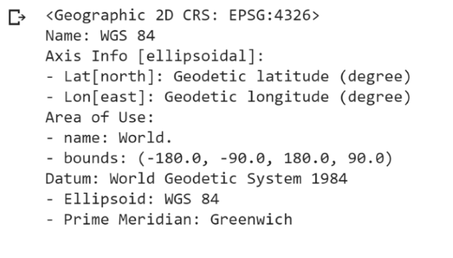 As a side note, spatial data may be formatted in different Coordinate Reference Systems (CRSs). A CRS defines how a two-dimensional, projected map relates to the real places on the earth. We can check the CRS as well as other metadata stored in the shapefile.