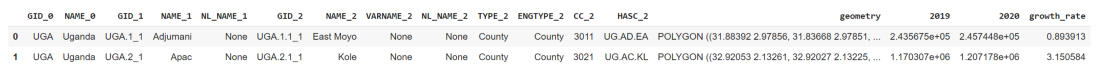 uga_gdf['growth_rate'] = uga_gdf[['2019', '2020']].pct_change(axis=1)['2020']*100