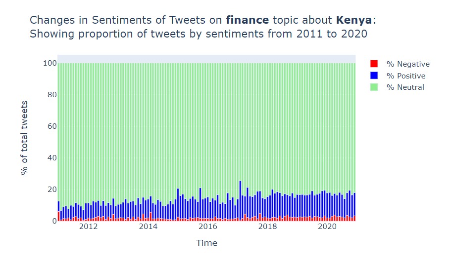 To accomplish that, a series of keywords have been defined for each topic, and tweets containing a defined keyword and the word âAfricaâ or the name of an African country would be scraped. For example, with the topic âFinanceâ, the keywords, âfinanceâ, âinvestmentâ, âeconomyâ, âeconomicâ, âincomeâ, âbankingâ, and etc, have been used.
