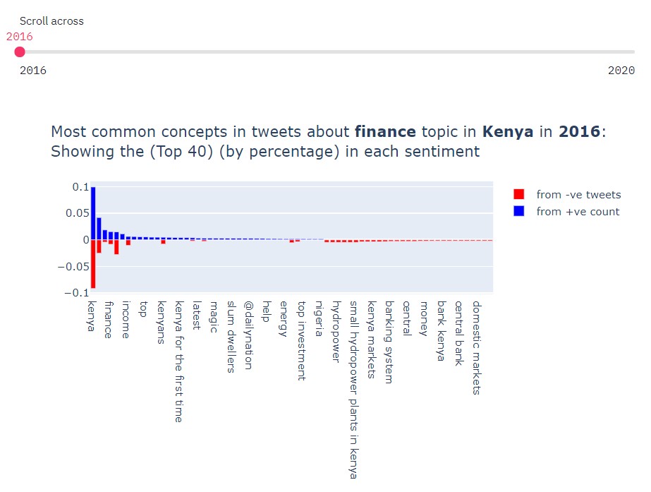 In a more accessible and insightful way, a slide bar of years, shows the top 40 most frequent words/phrases appearing in the tweets of a topic (split by sentiment) in a specific year.