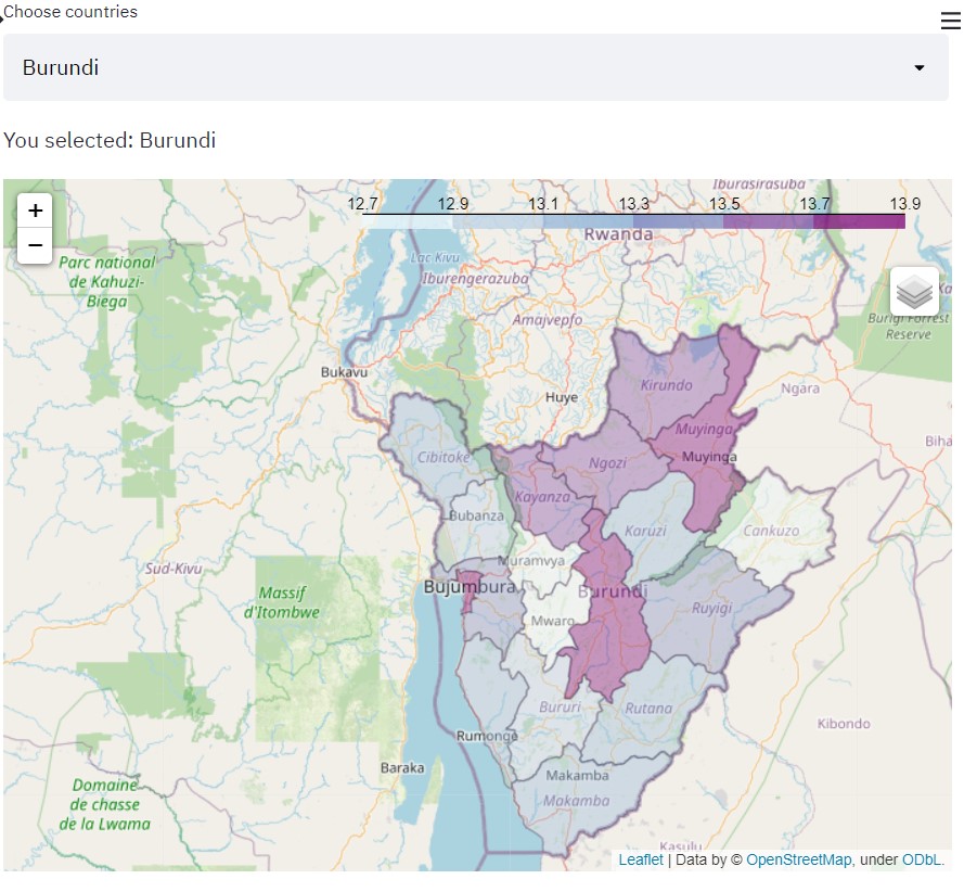 Population (the driver): The four SDG themes are set against the population distribution in Burundi so that either the communities with high populations are selected (maximum impact) or with the lowest populations (increased need for development). The method used here: Sum the population within a community boundary and QGIS operation: Zonal Statistics.