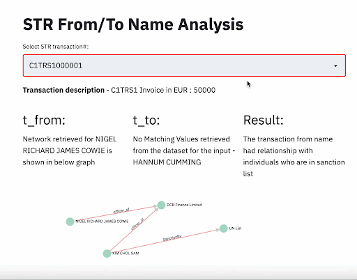 In this case, we took a sample CSV file having the columns – transactionnumber, transaction_description,t_from, and t_to representing a suspicious transaction report(STR). A field on Streamlit page will display all the transaction numbers in a dropdown.