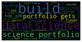 Now we can see some good words highlighted like Omdenaâs founder Rudradeb, build portfolio, and mainly data science, being the most highlighted words as Omdena builds scalable data science solutions and data science portfolio.